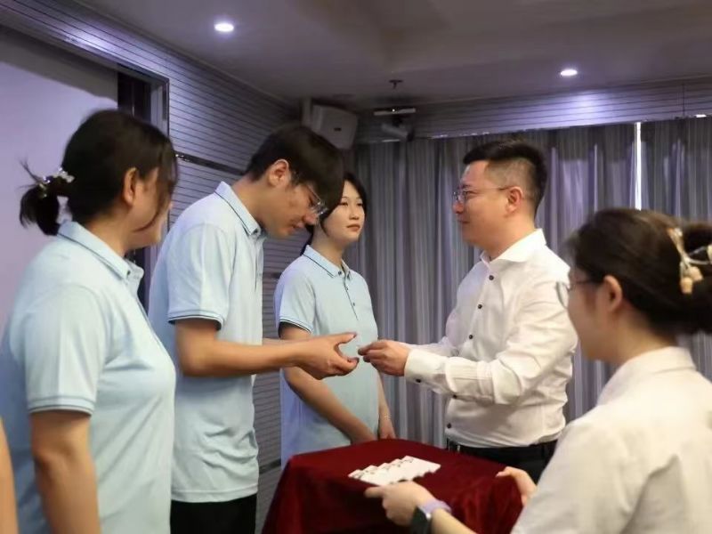 伴隨著激昂的音樂,入職儀式進(jìn)入了發(fā)放工牌的環(huán)節(jié)。國芳集團(tuán)各位領(lǐng)導(dǎo)面帶微笑,將蘊(yùn)含著公司信任與期望的工牌并伴手禮交到新員工手上,工牌在燈光的照耀下,折射出他們堅(jiān)定的信念和對(duì)新征程的信心。